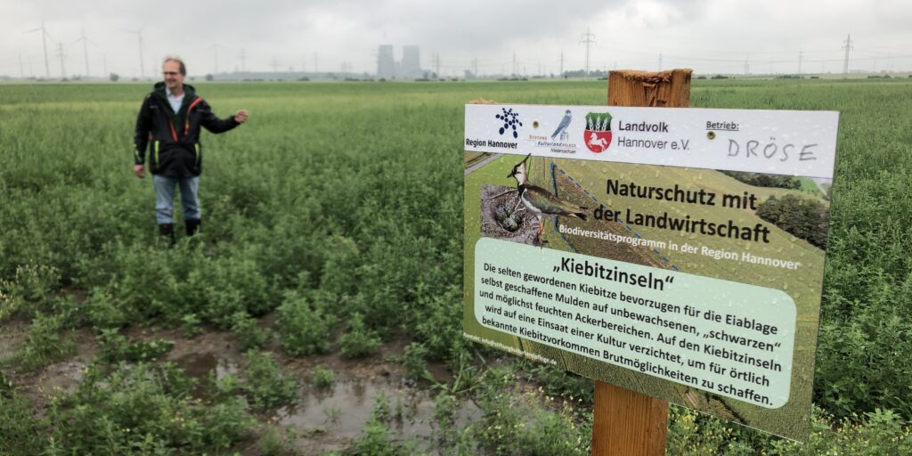 Seit fünf Jahren fördert die Region Hannover in Zusammenarbeit mit dem Landvolk Hannover und der Stiftung Kulturlandpflege die Einsaat von Blühstreifen, Stoppelbrachen als Futterquelle für Feldhamster oder Altgrasstreifen als Lebensraum für Feldhasen und Wiesenvögel. Die sogenannten Kiebitz-Inseln sind ein neuer Bestandteil im Biodiversitätsprogramm. Denn noch in den 1970er Jahren war der Kiebitz auf Feldern und Wiesen häufig zu sehen. Heute ist der Bodenbrüter aus vielen Agrarlandschaften verschwunden. Mit der Anlage von Rückzugsorten auf Ackerflächen soll der „stark gefährdeten“ Art die Aufzucht ihres Nachwuchses erleichtert werden.