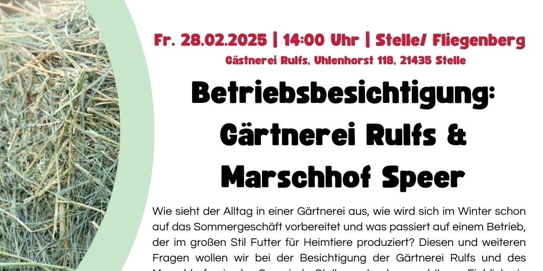 Los geht es um 14 Uhr bei der Gärtnerei Rulfs in Stelle, danach fahren wir gemeinsam zum Marschhof Speer nach Fiegenberg, wo wir den Tag dann am Ende der Besichtigung mit Suppe und Getränken ausklingen lassen.
