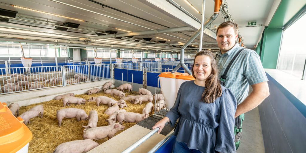 Der 2023 in Betrieb genommene neue Maststall basiert auf einem neuen Strohhaltungskonzept und vereint beispielhaft Hightech und Tierwohl. So sorgt zum Beispiel ein KI-gesteuerter Roboter für maßgerechtes Einstreuen des Stalls. Dort werden die Mastschweine mit Ringelschwanz und entsprechend der Haltungsstufe 3, sprich Frischluftstall mit reichlich Platz, gehalten. Davon kann sich auch die Öffentlichkeit überzeugen: Ein Besucherraum gewährt einen direkten Einblick in den Stall. Abgerundet wird der auf Regionalität und Kreislaufwirtschaft ausgerichtete Betrieb durch ein ausgefeiltes Energiekonzept mit Windkraft, Biogasanlage und Photovoltaik, das ihn in puncto Strom zu etwa 70 und bei Wärme zu 100 Prozent autark macht.