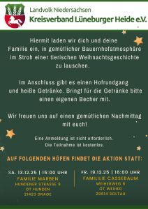 Bereits zum vierten Mal wird die beliebte Aktion „Geschichten aus dem Stroh“ vom Landvolk Kreisverband Lüneburger Heide organisiert. Kinder und Erwachsene sind herzlich eingeladen, sich kurz vor Weihnachten auf eine ganz besondere Weise mit einem Besuch auf einem Milchviehbetrieb auf die festliche Zeit einzustimmen.