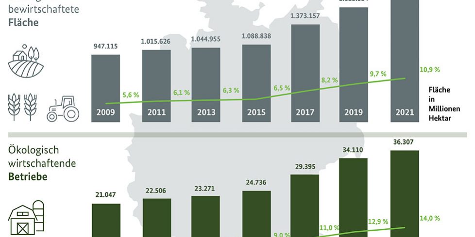 L P D – Rund 1,7 Millionen Hektar Land werden in Deutschland ökologisch bewirtschaftet. Damit weist Deutschland unter den EU-Ländern die viertgrößte Öko-Anbaufläche auf, zitiert der Landvolk-Pressedienst Zahlen von Eurostat. Insgesamt gab es nach Angaben des Statistischen Bundesamtes 2021 36.307 Bio-Höfe in Deutschland. Das entspricht einem Anteil von 14 Prozent. Der Flächenanteil der Biolandwirtschaft in Niedersachsen lag Ende 2021 bei 5,6 Prozent (bundesweit 10,9 Prozent). Das entspricht 143.024 Hektar.