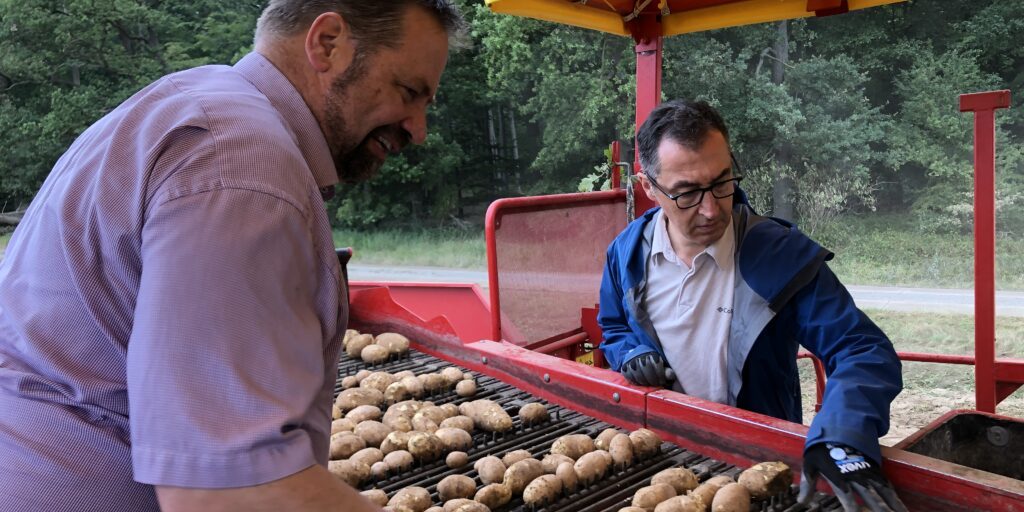 L P D – Einen Arbeits- und Austauschbesuch absolviert heute Bundeslandwirtschaftsminister Cem Özdemir beim Präsidenten des Landvolks Niedersachsen, Dr. Holger Hennies. Özdemir löste damit seine Zusage ein, den Präsidenten des niedersächsischen Landesbauernverbandes besuchen und bei ihm auch mitarbeiten zu wollen. Nach kurzer Begrüßung am frühen Morgen auf Hennies‘ Hof nahm der Landvolkpräsident den Bundeslandwirtschaftsminister persönlich mit zum Kartoffelacker. Zwei Stunden Kartoffeln roden und sortieren standen am Vormittag zu Beginn auf dem Programm. Danach folgte der Einsatz der Beregnungsanlage, die Vorstellung des Lernortes Bauernhof sowie Tüten-Packen und Fahrzeugbeladen für die Marktschwärmerei in Hannover. „Unser Bundeslandwirtschaftsminister zeigt sich sehr interessiert, engagiert und packt mit an. Das ist ein Austausch auf Augenhöhe, der für uns Landwirte in dieser Zeit sehr wichtig ist“, zieht Hennies in der Mittagspause eine kurze Bilanz zum Arbeitsbesuch, bei dem natürlich die aktuellen Herausforderungen der Landwirtschaft intensiv besprochen wurden.