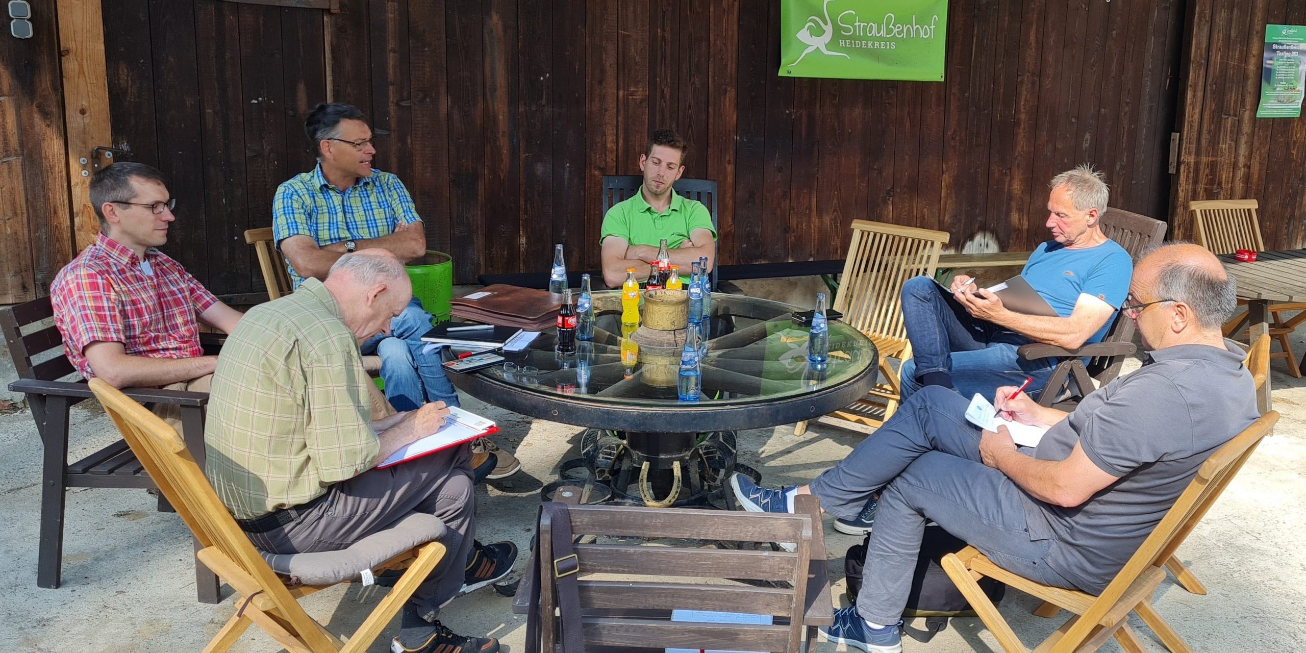 BU: Landvolk-Geschäftsführer Henning Jensen (l.) und Vorsitzender Jochen Oestmann informierten Vertreter der örtlichen Presse über den Stand der Früchte und die Marktlage im Heidekreis. Gastgeber Marcel Hambruch (Mitte) stellte seine Straußenfarm vor. Foto: Precht